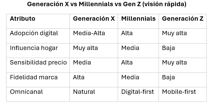 En la trilogía generacional, el mensaje es claro: Gen Z marca la tendencia, los Millennials consolidan el canal, pero Gen X sostiene el negocio hoy.